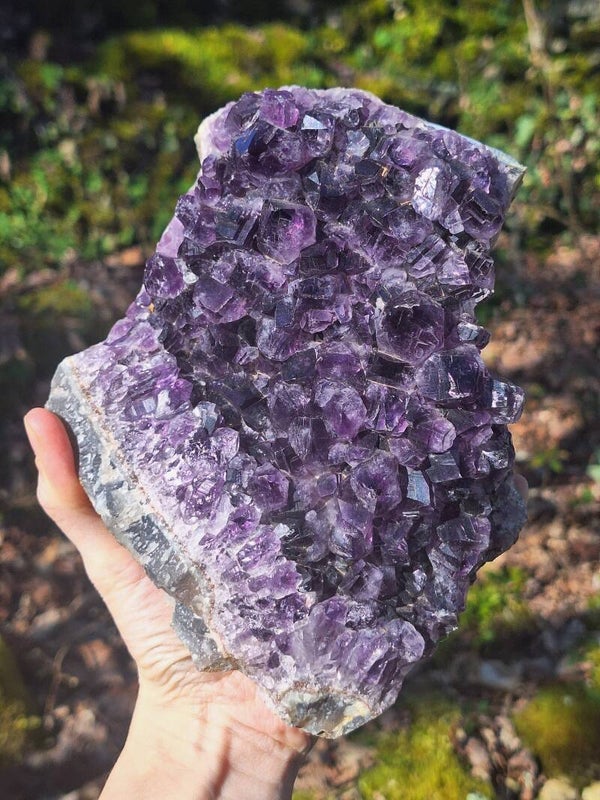 Bien connue des amoureux des pierres fines, reliée au chakra coronal, l'améthyste est une alliée pour les passages, les transitions, les alchimies sur notre chemin. Elle pourrait calmer les sentiments d'angoisse et harmoniserait les énergies de son porteur comme les lieux où elle se trouve. Les géodes ou amas pourraient servir pour purifier les autres pierres et cristaux, ainsi que de protéger, sanctuariser et élever le taux vibratoire de la pièce ou du lieu où ils se trouvent. Excellente pour calmer les maux de tête et migraines ; elle favoriserait l'ouverture du chakra couronne, la connexion à son intuition. Efficace pour nettoyer l'aura et équilibrer l'énergie des corps physique, mental et émotionnel.