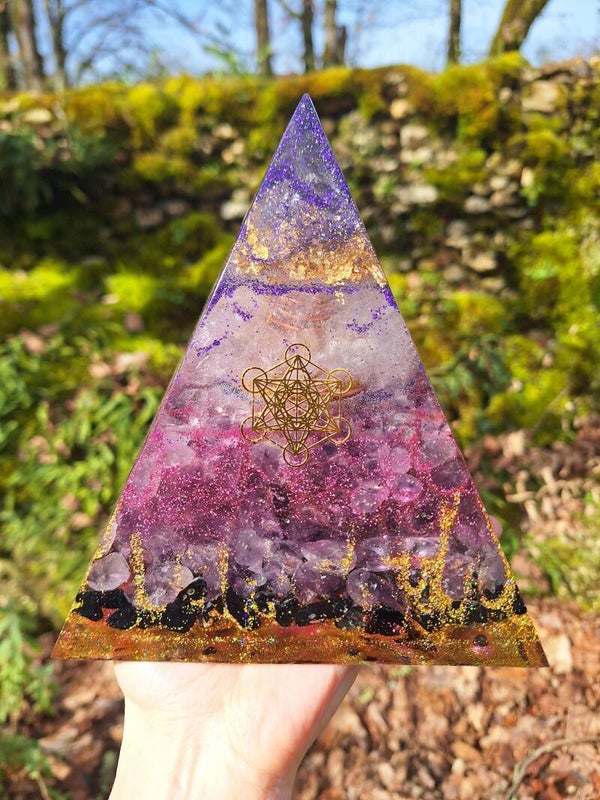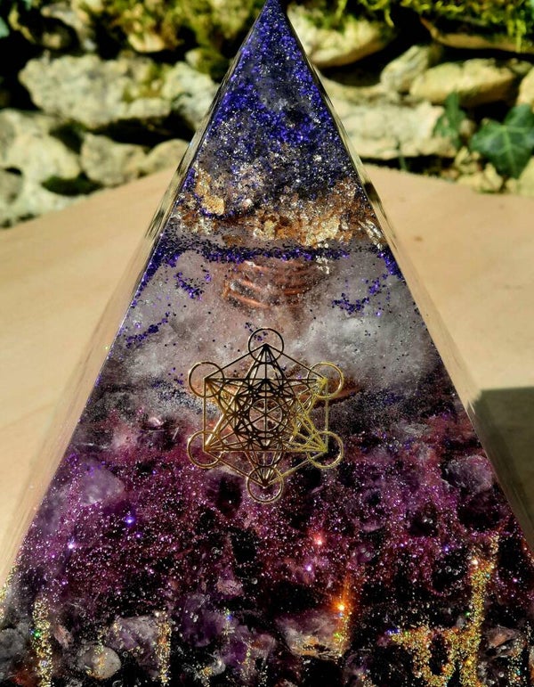 Cette magnifique Pyramide créée est composée de Pointe de Quartz & Cuivre, Quartz (Cristal de Roche), Améthyste & Tourmaline Noire.