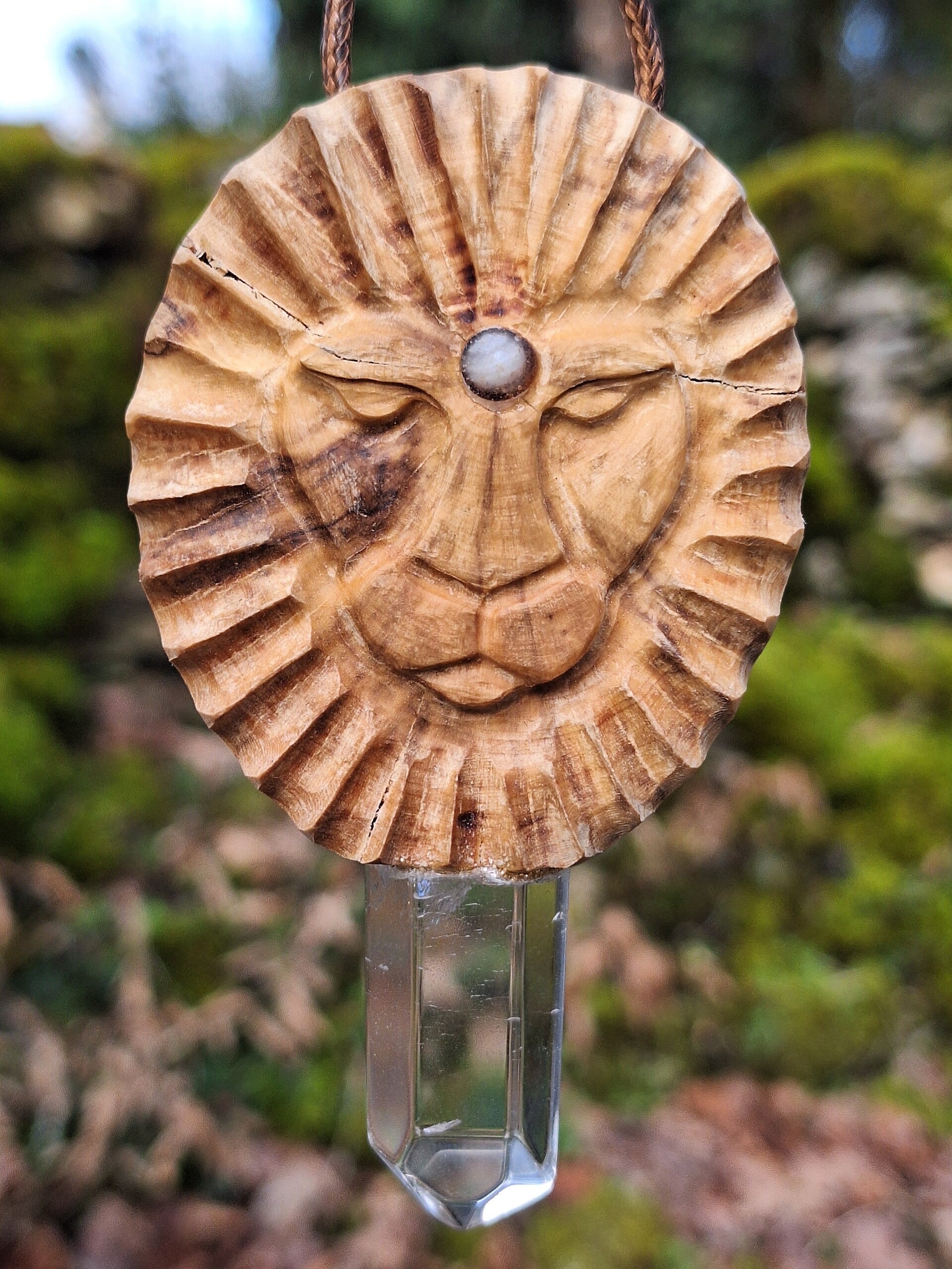 Amulette Urmah en Buis de notre Forêt, Calcédoine bleue et Cristal de roche.