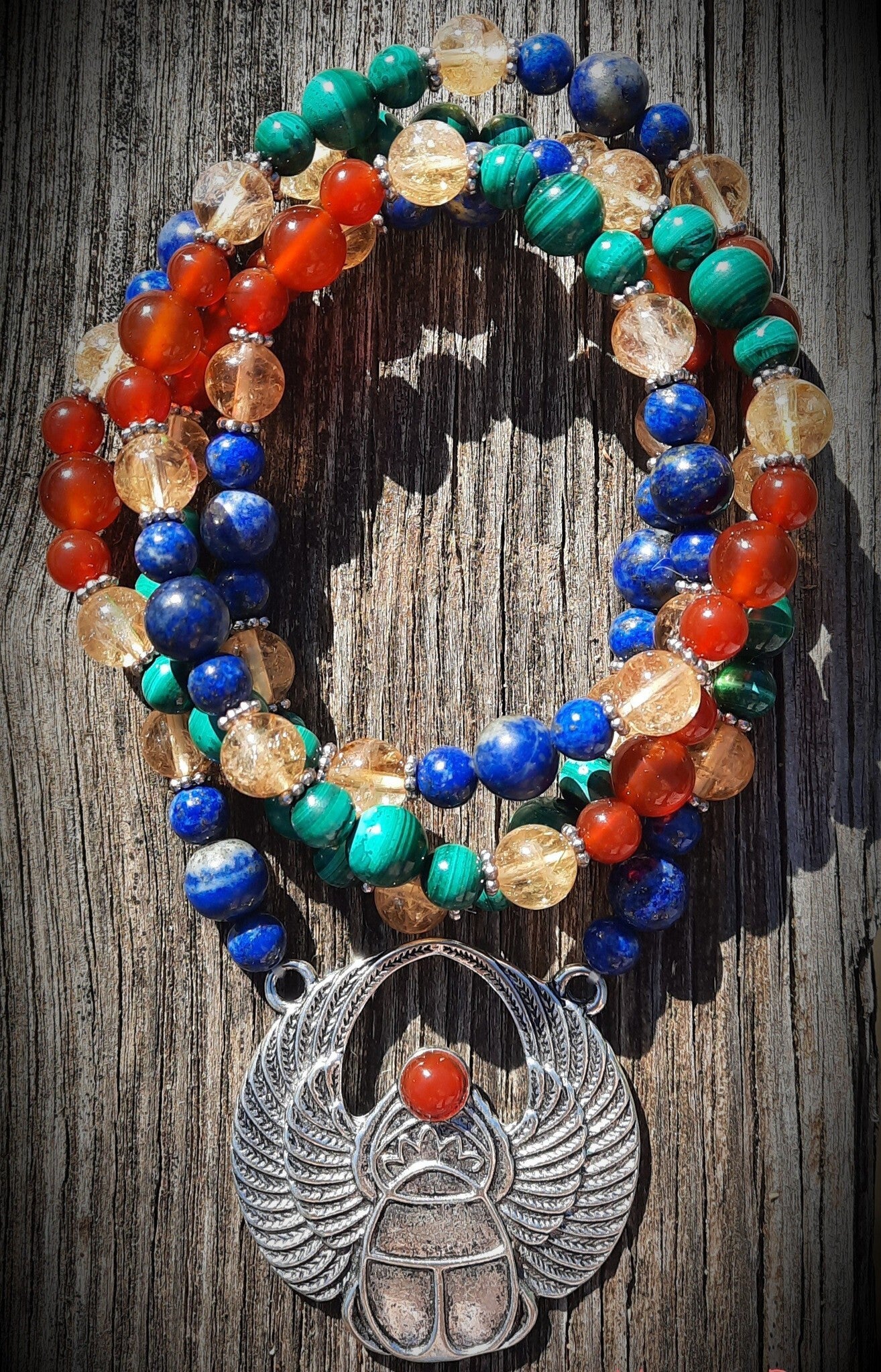 Mala 111 perles "Scarabée Royale Égyptien" en connexion avec la vibration Egyptienne : citrine, cornaline, lapis-lazuli & malachite, pendentif scarabée argenté avec demi-perle de cornaline, perles métallisées argent, élastique double rang.