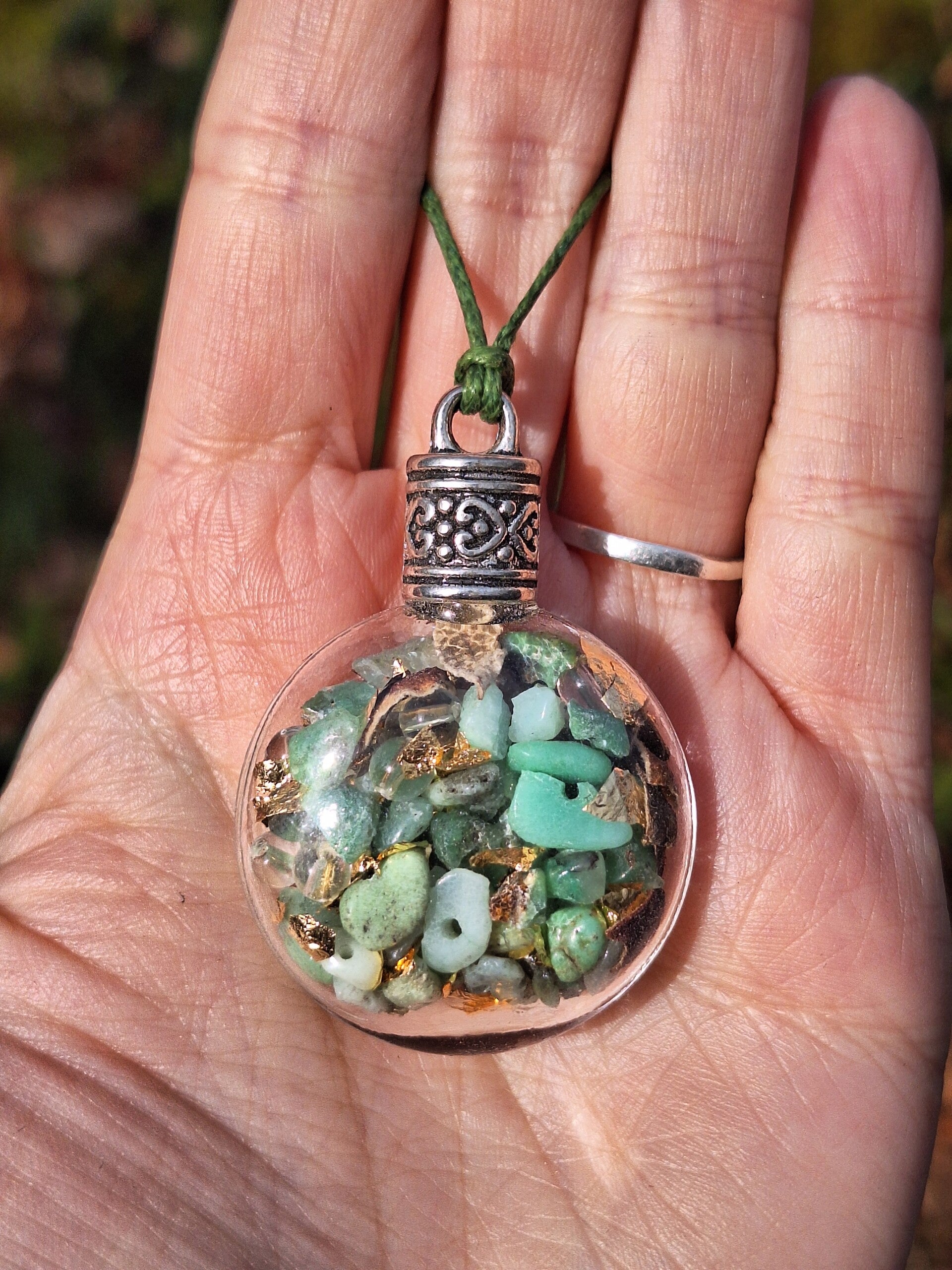 Pendentif "Fiole Magique" : création unique en lien avec l'énergie des Elémentaux, douce alchimie de la rencontre des cristaux et des végétaux, composée de Chrysoprase, Cristal de Roche, feuilles de Rose, paillettes & feuilles d'or.