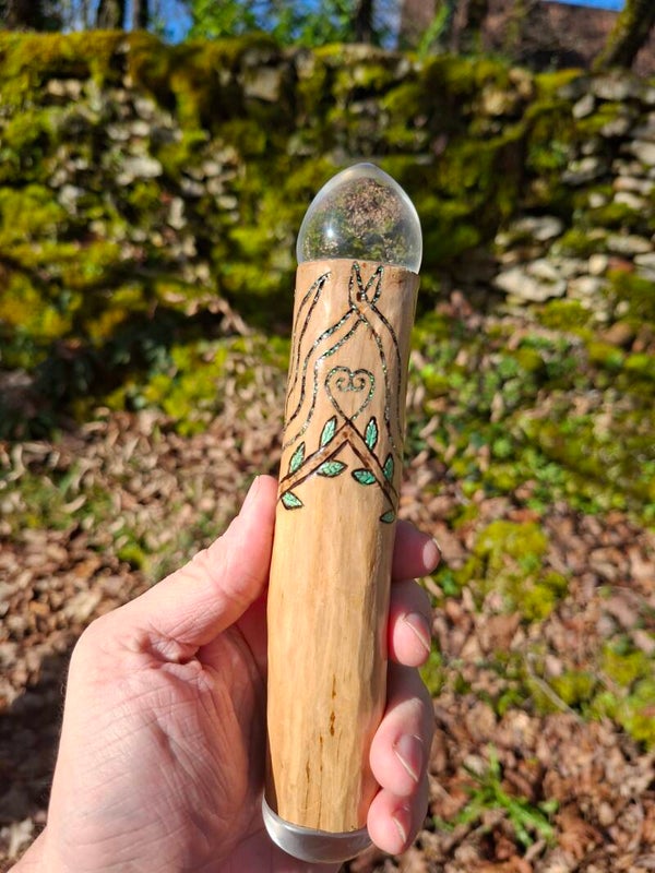 Manche en Bois de Sureau dans lequel se trouve un canon de cuivre rempli de Quartz et de pointes de Quartz. Une pièce de Quartz est fixée à chaque extrémités de la baguette pour la reception et l'émission de l'énergie filtré et amplifié par celle-ci.