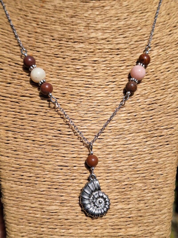 Collier Bois Fossile & Opale Rose créé à l'atelier.